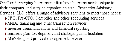 Prosperity Advisory Services, LLC tailors management services to meet the specific requirements of each client, typically resulting in part-time, interim assignments of various durations.